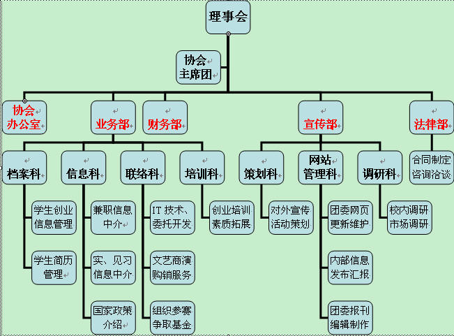 1、理事会作为最高权利机构与决策机构,由理事长——团委孙斌书记、副理事长——团委陈昊昱老师、协会正副主席和各部门部长组成。