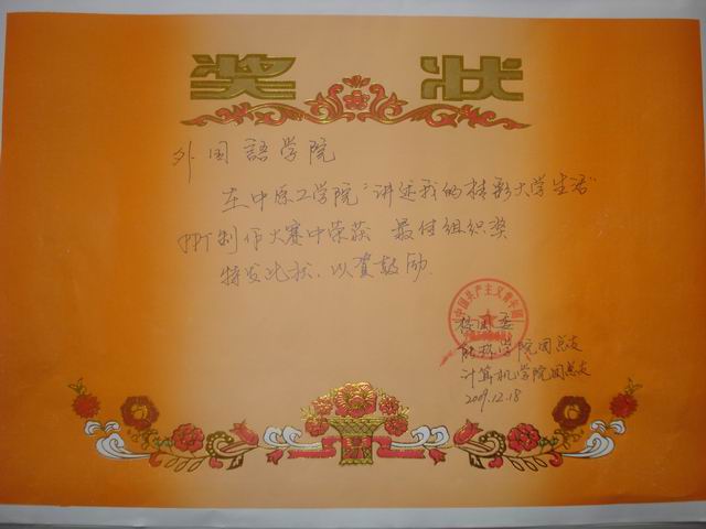 十大电子官网在2009年中原工学院迎元旦系列活动这一“讲述我的精彩大学生活”ppt制作大赛中,由于组织宣传成绩突出,参与人数多,被评为“最佳组织奖”。