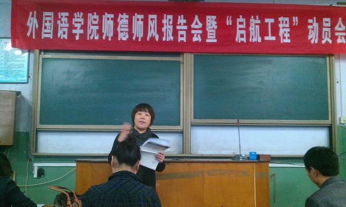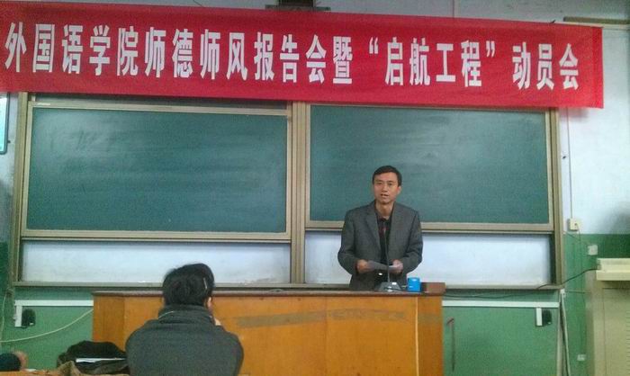 2012年10月26日下午,澳门十大电子正规游戏网站召开师德师风报告会暨“启航工程”动员会,澳门十大电子正规游戏网站全体教师共同学习了十大电子官网《教师课堂教学行为规范》和《教学事故认定及处理办法》。校师德师风报告团成员董学武教授为全体教师做了《师德的内涵和修养》的专题报告。董教授结合自己的生活和求学经历,论证了师德就是爱教育、爱学生的深刻内涵,师德修养就是师德认知和师德养成两部曲的实践总结。