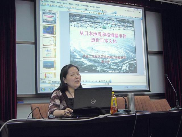 4月26日,澳门十大电子正规游戏网站在4号楼311举办了从日本地震和核泄漏事件透析日本文化的讲座。本次讲座由十大电子官网李向东书记主持,日语专业获得博士学位的蔺老师主讲。晚上6点日语专业的100多名学生全部到场后,外语文化月系列日语文化之讲座正式拉开序幕。