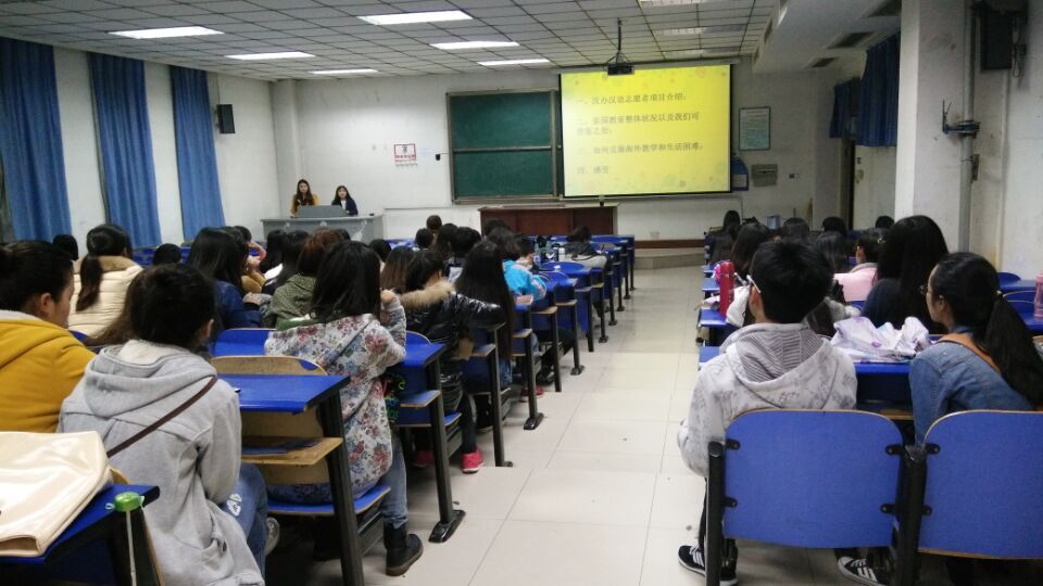 2014年5月份,经过国家汉办的选拔、培训和考核,澳门十大电子正规游戏网站4名2014届毕业生,作为汉语教师志愿者踏上了前往泰国传播中华文化的征程。2015年3月15日,这批志愿者圆满完成了国家汉办交付的任务后返回祖国,我们邀请了其中两位2位志愿者教师吴亚陈和睢晓梦为十大电子官网学生作交流报告。