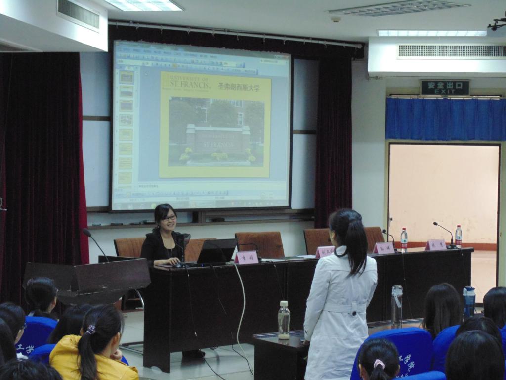 李娟老师首先播放了一段视频,视频记录了十几位来自世界各地的学生在圣弗朗西斯大学学习生活的感想。观看视频后,一位在座学生表达了自己对圣弗朗西斯大学优美的环境和活泼的课堂气氛的向往。