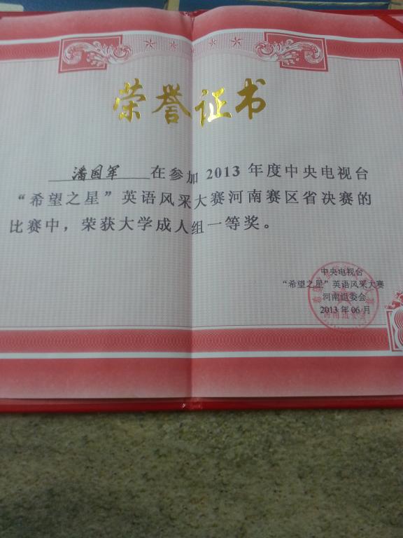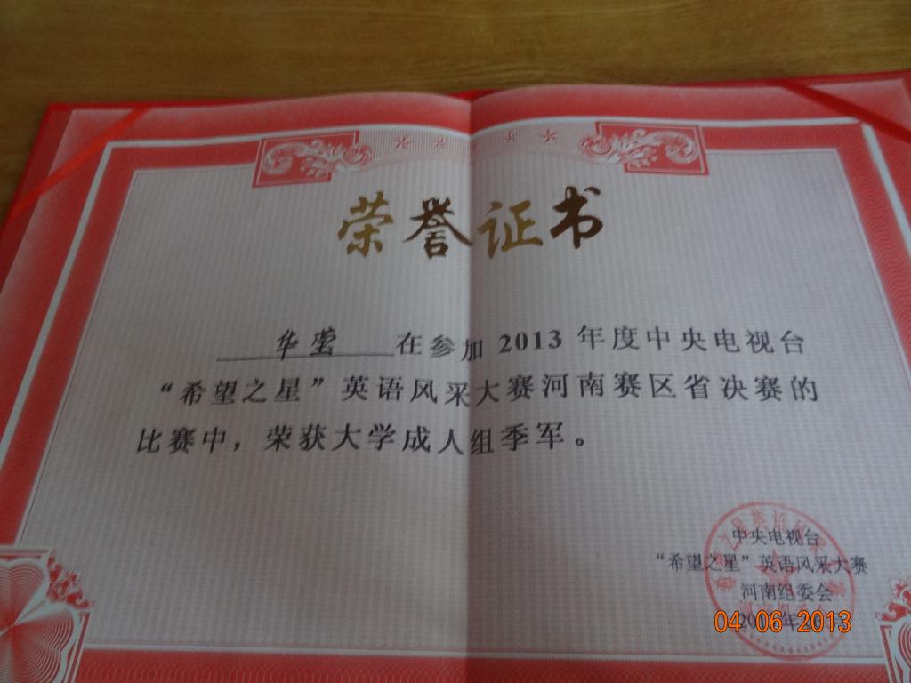 5月底,中央电视台“希望之星”英语风采大赛河南赛区选拔赛在郑州科技学院举行,在十大电子官网澳门十大电子正规游戏网站领导的大力支持下,澳门十大电子正规游戏网站由魏东峰老师指导的华莹同学和由郝玉娟老师指导的潘国军同学晋级到河南赛区总决赛。5月31日到6月2日,河南赛区总决赛在洛阳举行,魏东峰老师带队前往洛阳参加比赛,历经三轮角逐,十大电子官网两位同学在最后一轮十进五淘汰赛中脱颖而出,双双进入前五名,从而获得到北京参加比赛的资格,这是十大电子官网英语专业学生首次进入此类国家级级别比赛。华莹同学获得了季军和“最具机智灵活奖”两个奖项。(陈慧/文图)
