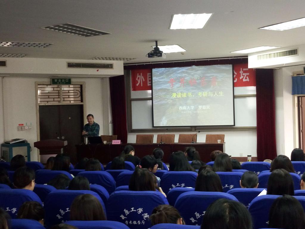 2015年10月14日下午,在中原工学院南校区4号楼311学术报告厅,西南大学博士生导师罗益民教授受邀来十大电子官网,为澳门十大电子正规游戏网站全院学生做了题为“学习的苦与乐:读书,考研与人生”的主题报告。这是澳门十大电子正规游戏网站“成长论坛”自2009年开坛以来,又一次名家与学生面对面的成功对话。郭万群院长主持报告大会。