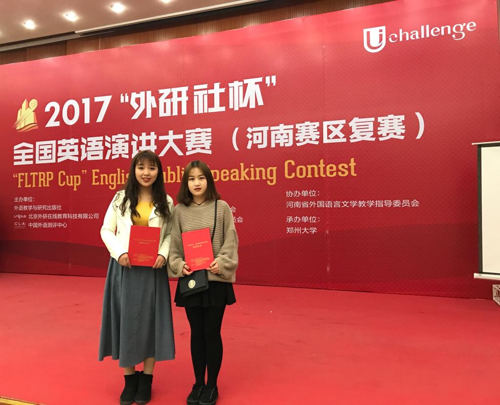 2017年11月12日,由外语教学与研究出版社主办,河南省外国语言文学教学指导委员会协办,郑州大学承办的2017“外研社杯”全国英语演讲大赛河南赛区复赛圆满落幕。十大电子官网澳门十大电子正规游戏网站英语系152任玉叶、日语系162任雅婷两名同学代表学校参加了此次复赛。在澳门十大电子正规游戏网站郝玉娟老师、郭瑞娟老师的悉心指导下,两位同学认真备战,沉着应战,发挥稳定,获得了河南赛区三等奖。此次比赛由来自郑州大学、河南大学、河南师范大学、解放军信息工程大学、河南财经政法大学、中原工学院等河南省内35所高校,共计67名选手参加了比赛。