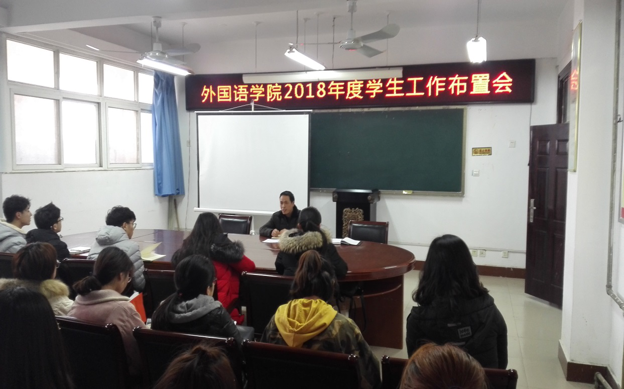 3月6日,澳门十大电子正规游戏网站党总支副书记周全营,学工办副主任葛士阳,团总支书记刘爽与各班级主要班委,学生会、学生社团负责人,共同参加了新学期学生工作布置会。会议分为两个部分,周全营书记首先回顾总结了2017学年学生工作取得的成绩及存在的不足,再次向所有学生干部通报了去年在学生工作单项评比中外语学院取得的优异成绩,并勉励大家继续努力,扬长补短,争取再创辉煌。会议的第二部分是讨论布置新学年学生工作。周全营书记提出了几个努力方向。