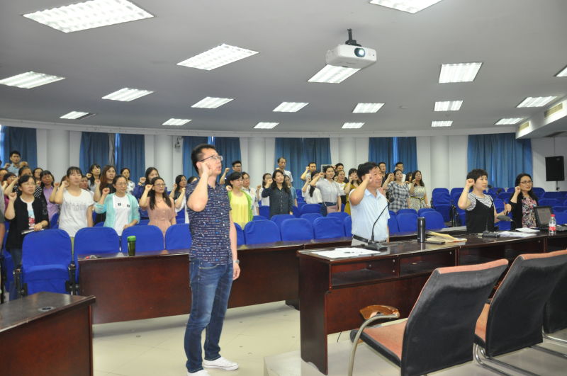 首先,澳门十大电子正规游戏网站党总支书记姚晓鸣教授传达学校下发的《关于学习宣传贯彻习近平总书记在纪念马克思诞辰200周年大会上重要讲话精神的通知》和《关于教育系统深入学习贯彻习近平总书记在北京大学师生座谈会上重要讲话精神的通知》,要求学院教职员工深刻领会习近平总书记两个重要讲话精神的丰富内涵、精神实质和重大意义;深入学习两个重要讲话精神,扎实办好中国特色社会主义大学;积极做好引领,引导广大师生勇担时代大任;迅速掀起学习贯彻习近平总书记两个重要讲话精神的热潮。随后,在英语系副主任刘丽老师的带领下,全体教师起立重温了教师的誓言。接着,姚书记针对前期课程评估中出现的问题进行总结,结合问题提出了改进的方法。随后,澳门十大电子正规游戏网站副院长柴高洁针对本学期期末考试注意事项进行了安排部署。