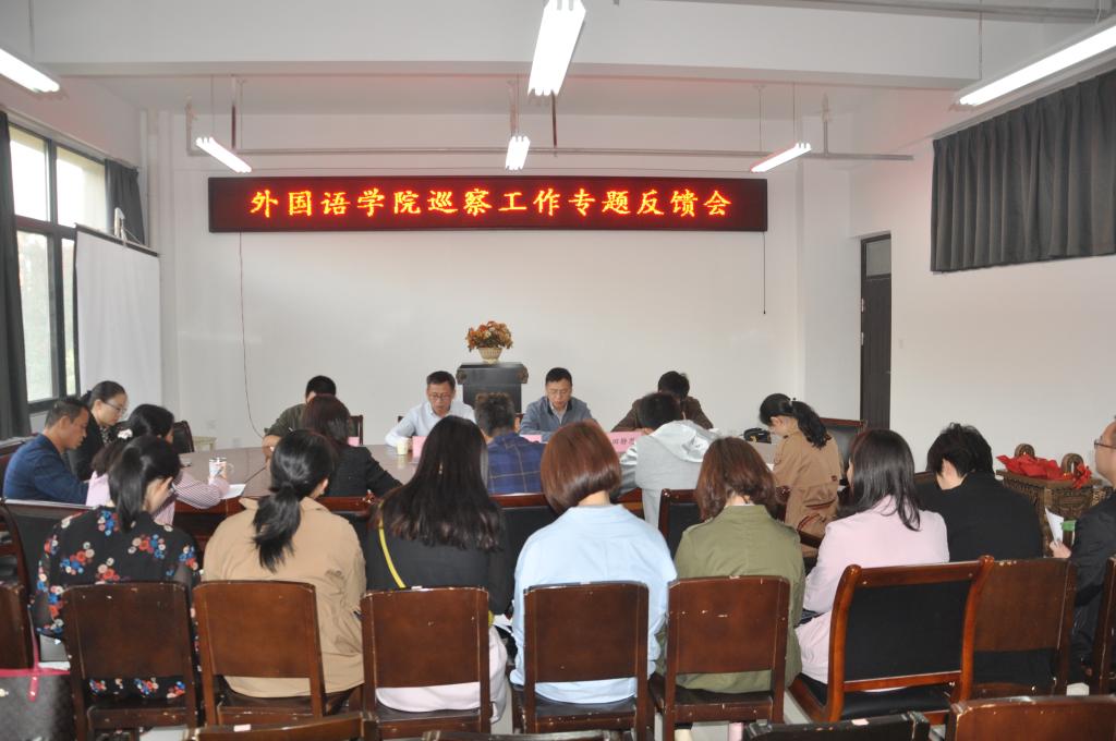 巡察工作专题反馈会,由澳门十大电子正规游戏网站党总支书记姚晓鸣主持,学校第一巡察组组长李惠杰同志代表巡察组从三个部分反馈了巡察情况,重点提出发现的主要问题。随后,澳门十大电子正规游戏网站姚晓鸣书记代表澳门十大电子正规游戏网站党政班子表态,第一巡察组既肯定了外语学院近年来的教育教学发展和党建成绩,更指出了巡察发现的问题。对于巡察组提出的整改意见和要求,澳门十大电子正规游戏网站一定坚持问题导向,全面推进整改落实;突出建章立制,常态长效抓好整改;用好巡察成果,持续推荐从严治党,全力推进教育教学、人才培养高质量发展;对标十九大精神、对标省委十届六次全会暨省委工作会议精神,对标“四个回归”,对标学校“大类招生、交叉培养、外语突出、实践达标”人才培养模式和“更名大学、取得博士学位授予权”的发展战略。