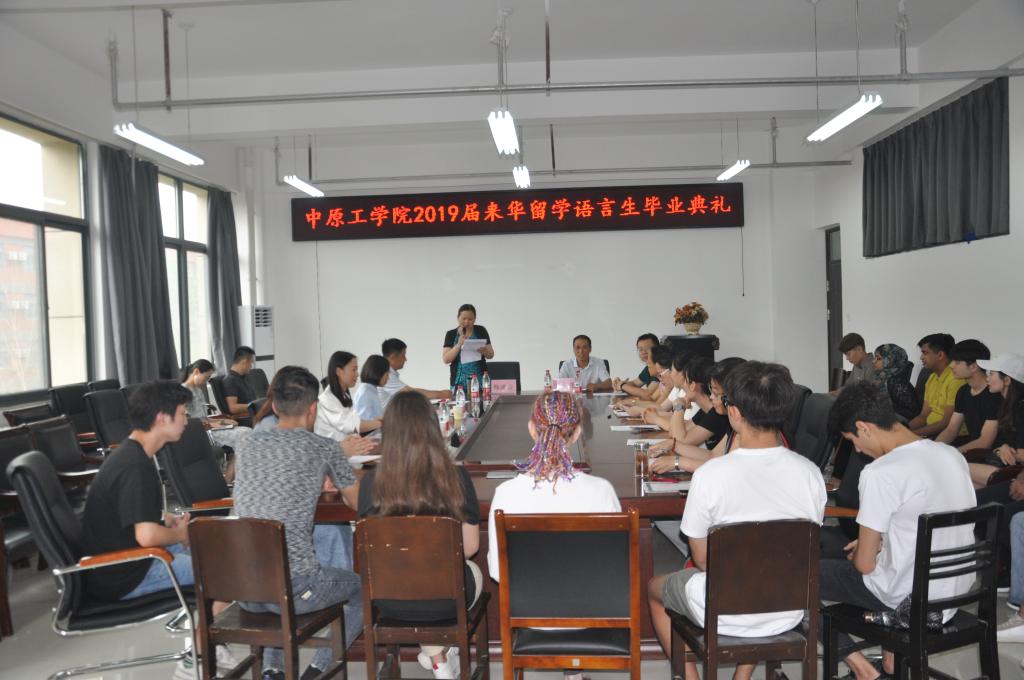 2019年6月27日下午在3号组团A402会议室,十大电子官网2019届来华留学语言生结业典礼顺利举行。中原工学院副校长曹健,国际合作与交流处处长谭恒,澳门十大电子正规游戏网站院长郭万群、澳门十大电子正规游戏网站党委书记姚晓鸣、副书记周全营、副院长杨道云、副院长柴高洁,来华留学生语言教学部主任彭琰,学工办副主任葛士阳,留学生任课教师以及全体来华留学语言生参加了此次典礼。结业典礼由澳门十大电子正规游戏网站副院长杨道云主持。