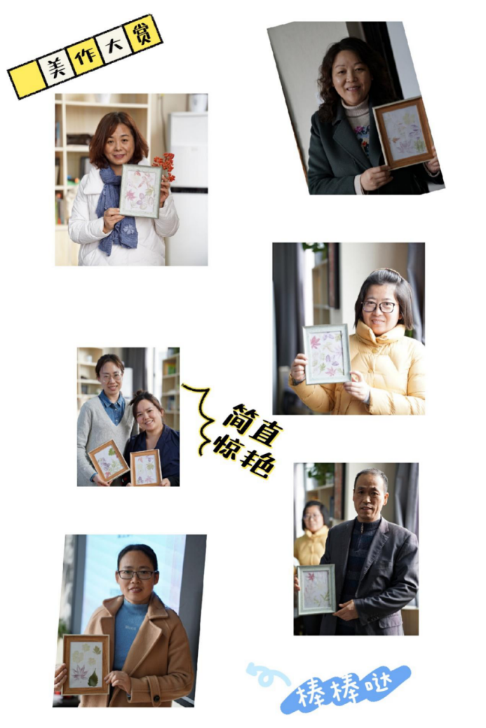 服装学院黄芳老师成立的“布可思绎”手工工作室的同学们带领各位老师们开展了手作活动,他们带来了活动需要的材料包,其中重要工具——艾蒿、枫叶、三叶草等植物都是来源于我们美丽的校园。听完“布可思译”工作室带队同学的讲解,老师们立刻开始自己制作,大家一起动手,用拓印的方式留住了美好的大自然,在欢声笑语中完成了属于自己的手工作品。