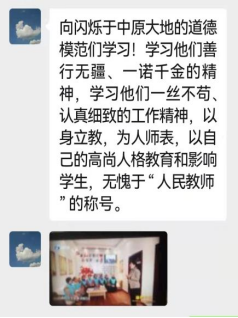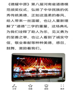 天行健,君子以自强不息;地势坤,君子以厚德载物。河南省道德模范评选表彰活动,每届选出助人为乐、见义勇为、诚实守信、敬业风险和孝老爱亲五类道德模范,一个个高尚的心灵,一个个温暖的故事,感人至深,催人奋进。从他们朴实无华的言语中,深深感受到了那份坚持与勇毅。他们在平凡的岗位上,在生活的奋斗中,用实际行动,为我们大家树立起了文明风尚的标杆,折射出了新时代河南人的魅力风采和道德光辉。我们深深感受到道德的力量是无穷的,我们要通过学习道德榜样,从而传递道德力量,让爱与奉献成为社会主旋律。(通讯员:张少霞)