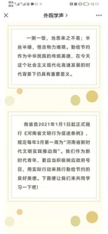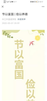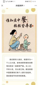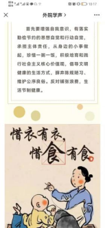 学院团委还利用微信公众号“外院学声”推送以“节以富国,俭以养德”为主题的文章,宣传《河南省文明行为促进条例》,引导青年学生响应政府号召,用实际行动践行中华民族勤俭节约的传统美德。