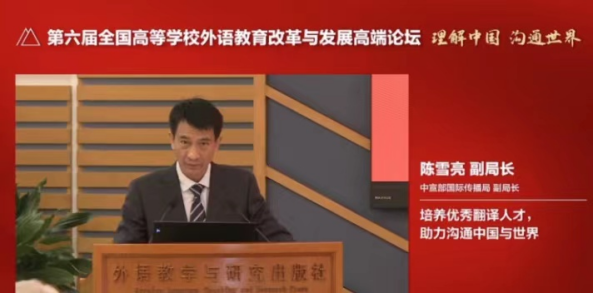 活动一:组织系部主任及教师参加第六届全国高等学校外语教育改革与发展高端论坛线上直播。3月19日至20日,学院组织全体系部主任及教师参加了通过线上直播的方式参加第六届全国高等学校外语教育改革与发展高端论坛。论坛以“理解中国,沟通世界”为主题,共同探讨了百年变局下中国高等外语教育发展新格局、改革新方向。论坛期间,中宣部国际传播局副局长陈雪亮作题为“培养优秀翻译人才,助力沟通中国与世界”的主旨报告。