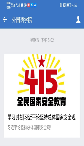 为拓宽活动渠道,学院利用企业微信公众号推送《习近平论坚持总体国家安全观》的内容,并动员学生发挥特长制作国家安全主题的微视频作品在企业微信公众号发布,提升了宣教效果。