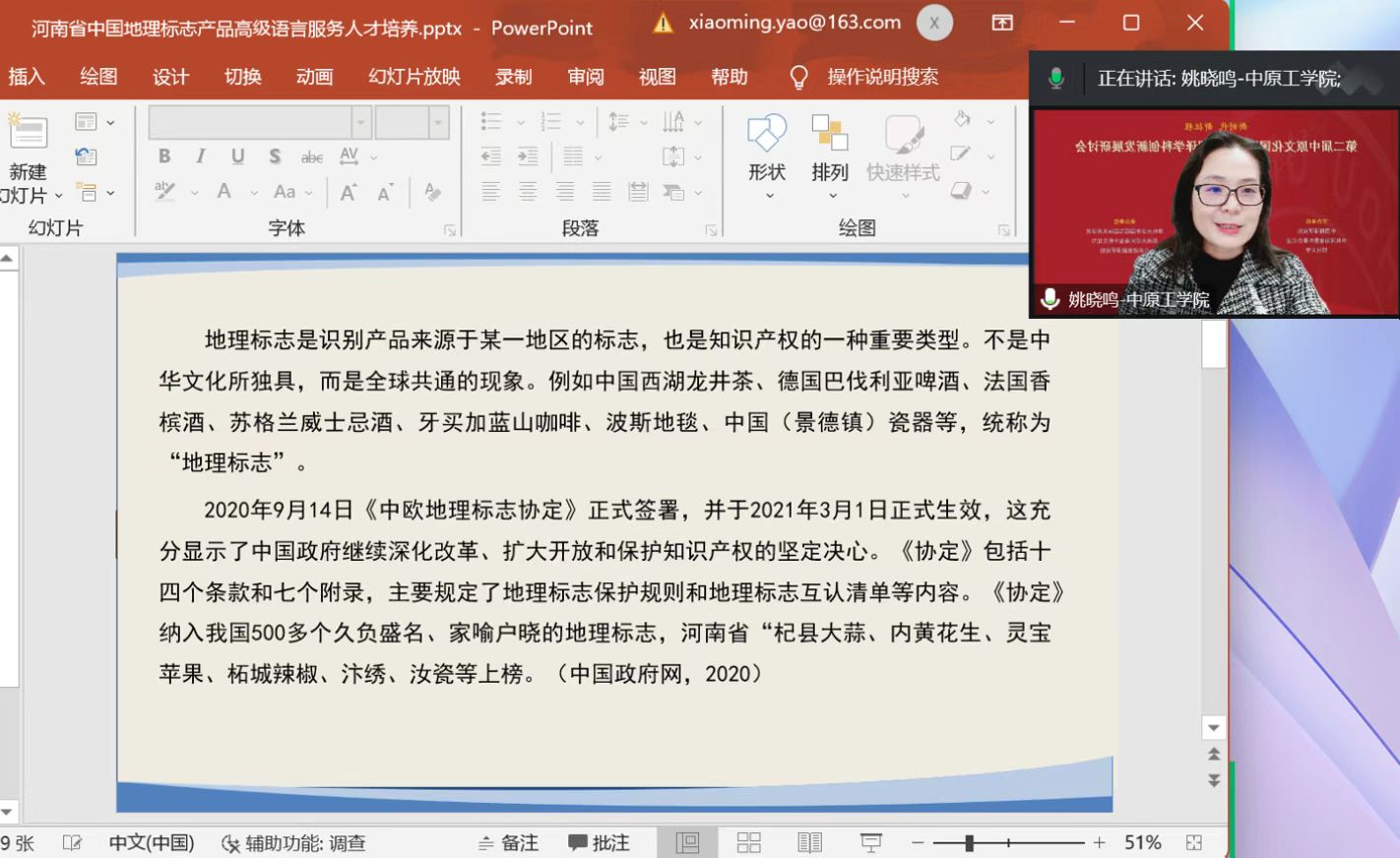 在下午的分论坛讨论环节,澳门十大电子正规游戏网站院长姚晓鸣教授做了题为“河南中国地理标志产品高级语言服务人才培养”的主旨发言,分享了中原工学院在“黄河文化翻译与传播”方面所做的最新研究成果。姚晓鸣教授指出,地理标志产品不仅是物质文化的传承和传播,也是历史文化和精神文化的传承和传播,研究中国地理标志产品的海外推广和中国地理标志产品的高级语言服务人才培养,对促进河南文化传播、探索校企高级语言服务人才培养路径具有重要理论与实践意义。