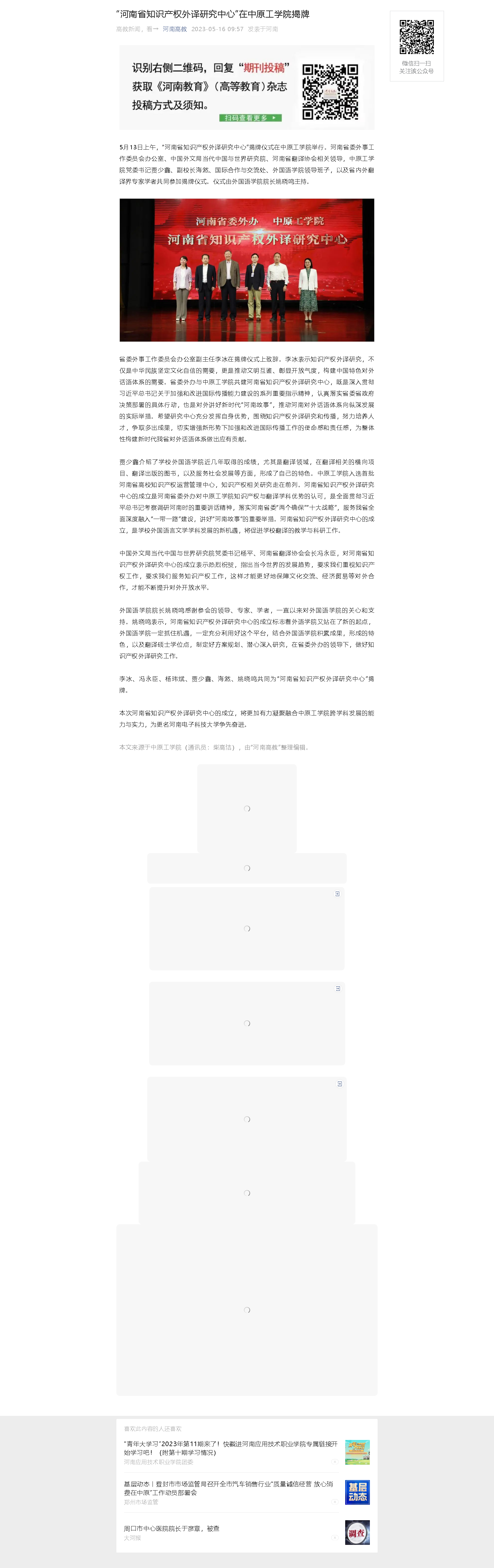 5月13日上午,“河南省知识产权外译研究中心”揭牌仪式在中原工学院举行。河南省委外事工作委员会办公室、中国外文局当代中国与世界研究院、河南省翻译协会相关领导,中原工学院党委书记贾少鑫、副校长海然、国际合作与交流处、澳门十大电子正规游戏网站领导班子,以及省内外翻译界专家学者共同参加揭牌仪式。仪式由澳门十大电子正规游戏网站院长姚晓鸣主持。