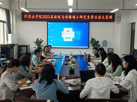 2023年6月2日,澳门十大电子正规游戏网站在会议室举行2023届新闻与传播硕士研究生毕业论文答辩会。河南省广播电视台副台长卢慎勇,澳门十大电子正规游戏网站院长姚晓鸣,副院长柴高洁,教授段士平,副教授余天敏,副教授郭建、研究生秘书以及2021级8名学生参会。