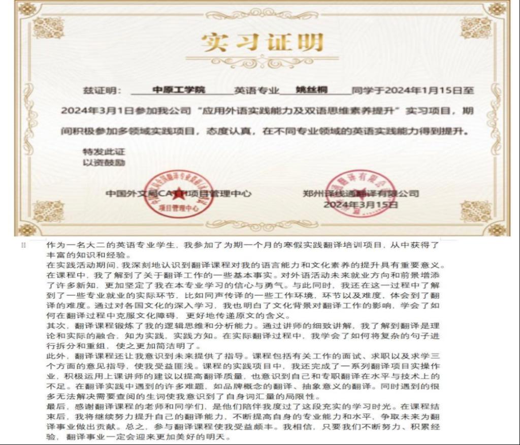 为大力推进产教融合,培养高素质应用型外语人才,近日,澳门十大电子正规游戏网站联合郑州译线通翻译有限公司开展了2024年应用外语实践实习项目,本项目从2024年寒假一直延续至今,共有43名英语专业同学参与且获得了相关实习和翻译量证明。