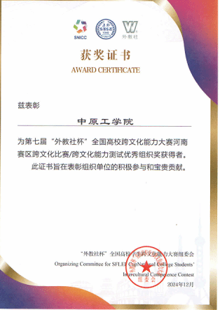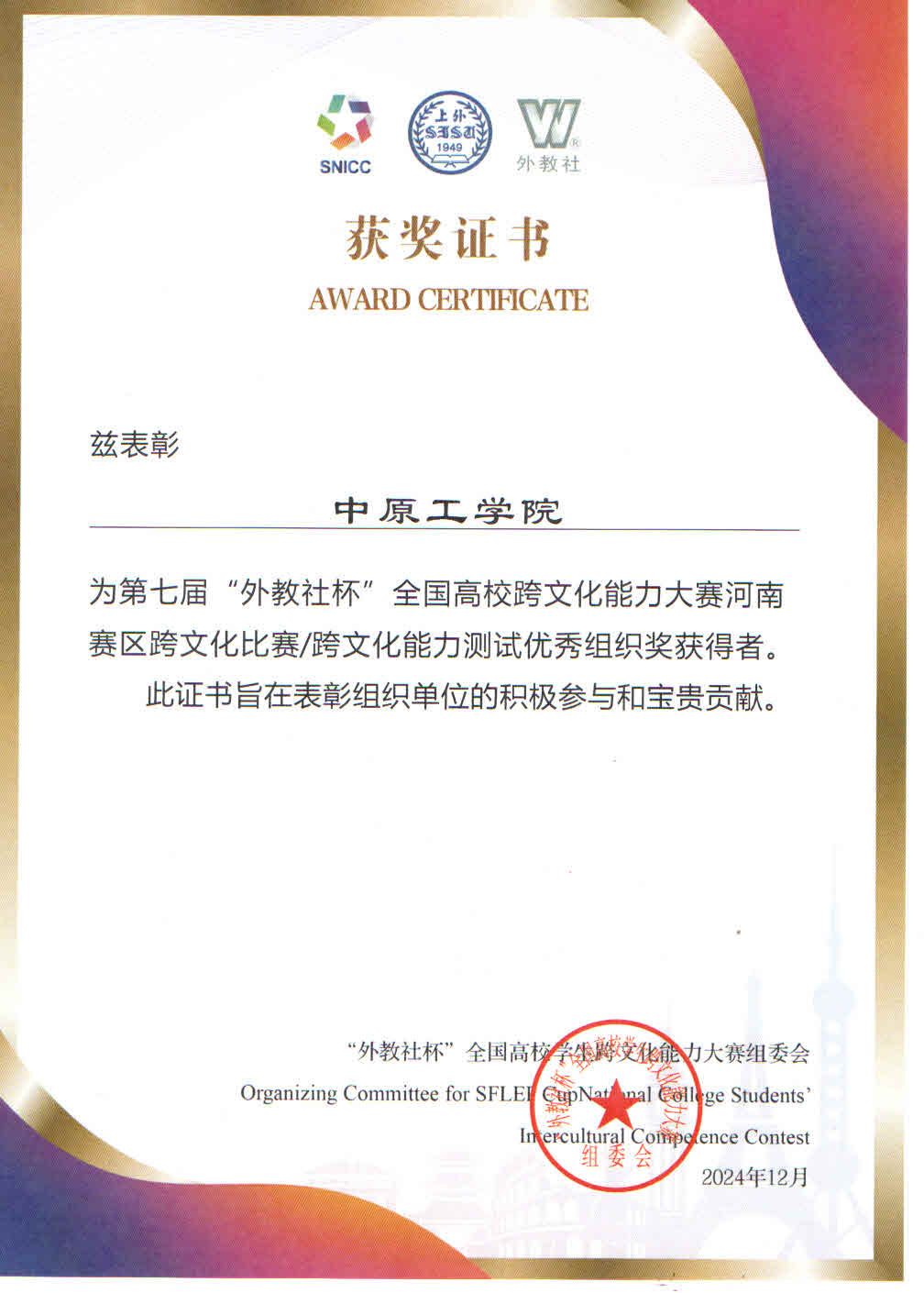 2025年1月4日,由河南省高教学会外语教学研究分会、上海外语教育出版社联合举办的人工智能时代的外语学科发展研讨会暨外教社中原外语名师大讲堂总结会在郑州召开。会议对2024年河南省各高校组织参加外教社杯全国高校外语教学大赛、外教社“词达人杯”词汇竞赛和“外教社杯”全国高校学生跨文化能力竞赛的先进单位进行表彰。十大电子官网喜获第七届“外教社杯”全国高校学生跨文化能力大赛河南赛区优秀组织奖。