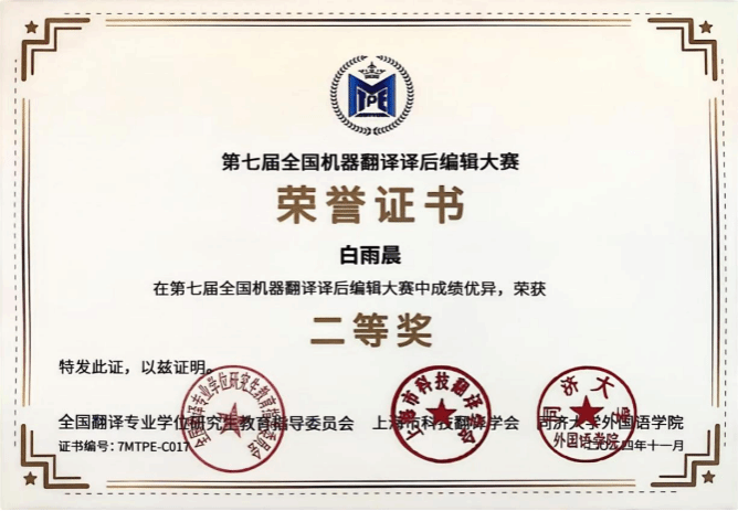 近日,由全国翻译专业学位研究生教育指导委员会指导,上海市科技翻译学会和同济大学澳门十大电子正规游戏网站联合主办的 “第七届全国机器翻译译后编辑大赛” 圆满落幕。澳门十大电子正规游戏网站翻译硕士研究生白雨晨获全国二等奖。