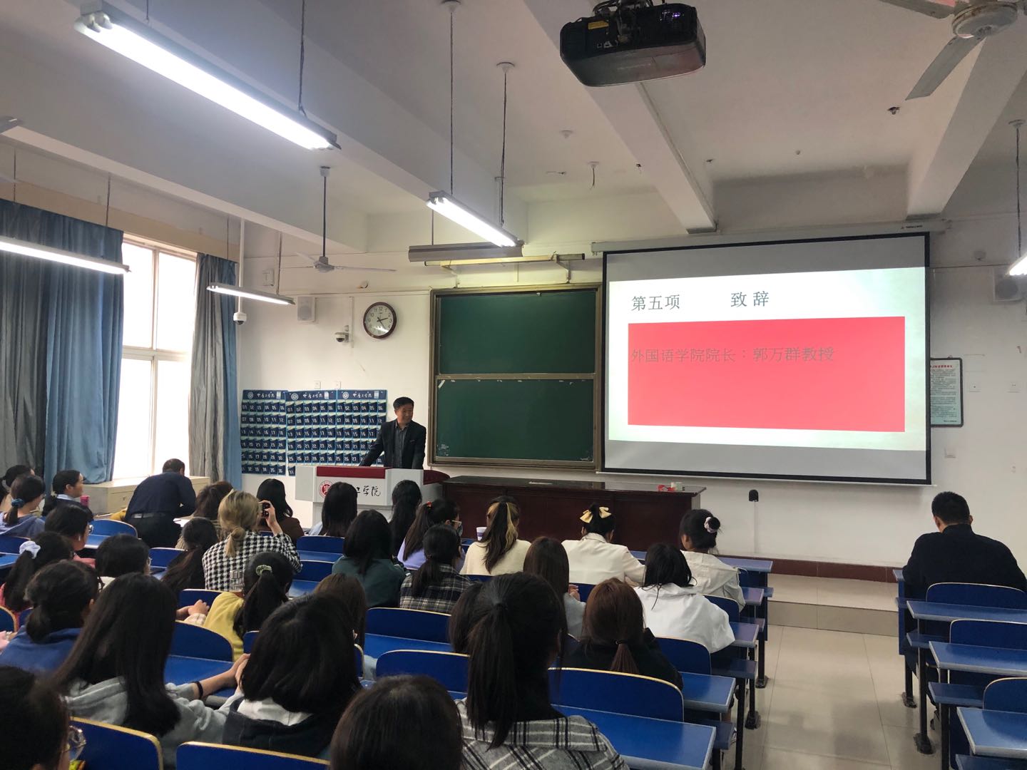 郭万群院长围绕 “明德至善”进行讲话并致辞,对澳门十大电子正规游戏网站的整体师资情况进行介绍,让新生对澳门十大电子正规游戏网站有了更深层次了解,以问答启迪大学意义,最后提出了“LLCCCC”(Language Learning Critical Creative Cultural Cooperate)的素养要求,并用Wish you have a meaningful and healthy life表达了对新生的祝愿。