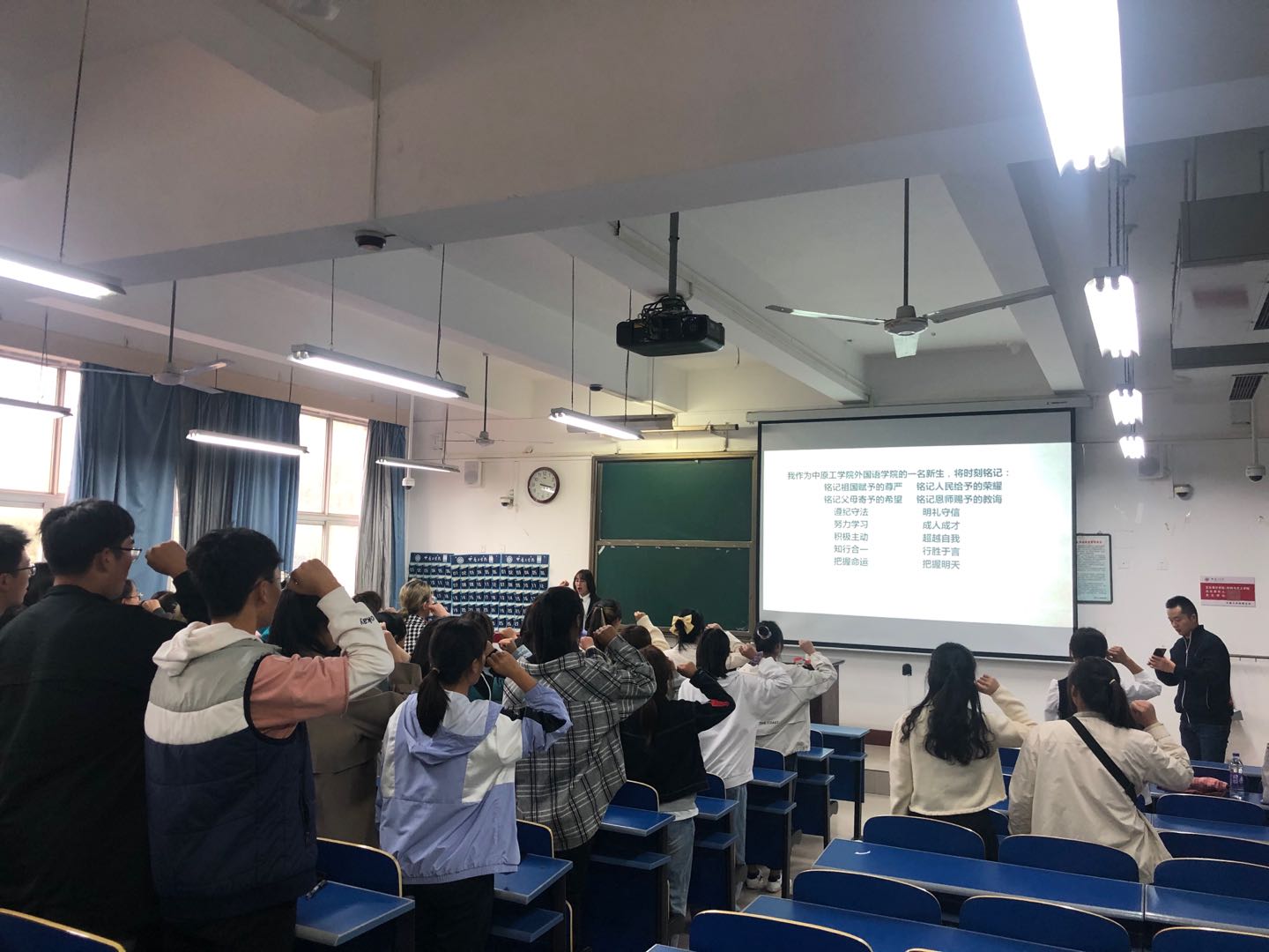 最后由日语201班刘美娜同学领誓,全体新生共立拳拳誓言,本次大会在庄严的宣誓词中圆满结束。