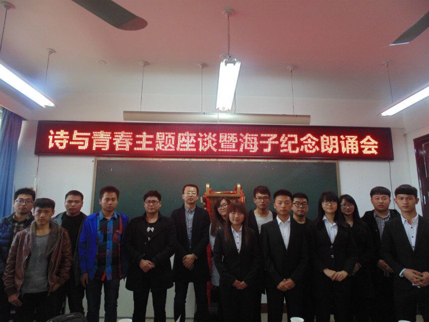 为促进诗歌爱好者之间的交流,增加学生一些与诗人见面交流的机会及纪念海子逝世27周年。2016年3月26日,澳门十大电子正规游戏网站柴高洁老师于11号楼214举办——诗与青春主题座谈会暨海子纪念朗诵会。出席本次座谈会的有河南省作家协会会员、青年诗人吴相渝;青年作家、诗人、河南省作家协会会员牛冲;青年作家,网络作家,河南青作协成员、榕树下签约作家宗隆隆;《郑州大学报》特约撰稿人,漯河市作家协会会员,河南省诗词研究会漯河分会理事弯文奎;河南省元十个文化传媒有限公司联合创始人,《元诗歌报》主编徐方方;郑大文学院大三在读生郭林杰以及从华北水利水电大学、河南工业大学、郑州大学、商丘、巩义坐火车赶来参加座谈会的诗歌爱好者。