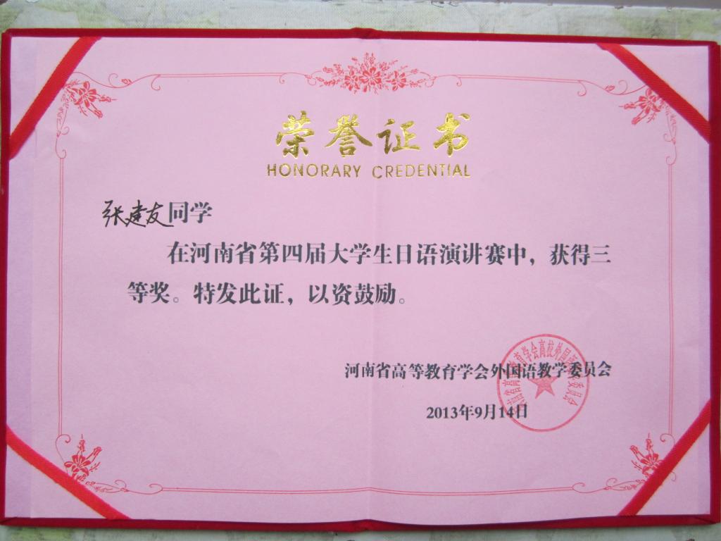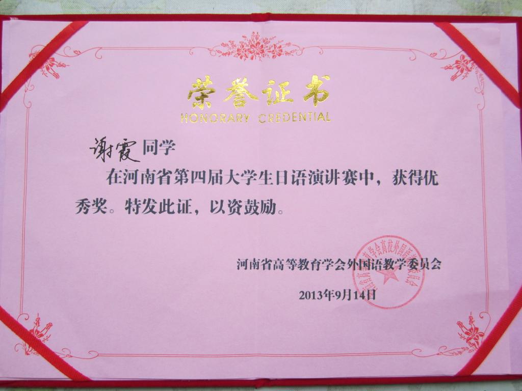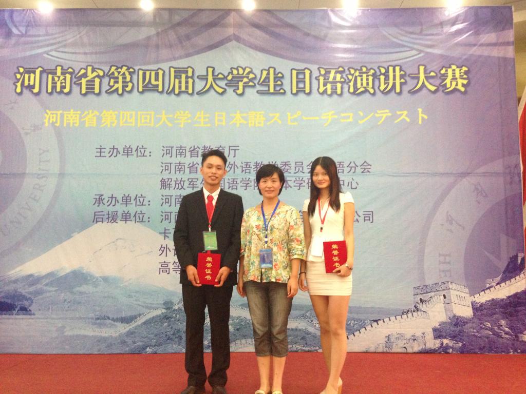 2013年9月14日,第四届河南省大学生日语演讲比赛在焦作成功举办,本次大赛由河南省教育厅及高等教育学会外国语教学委员会主办,河南理工大学承办,吸引了众多高校学生参赛。澳门十大电子正规游戏网站日语系10级学生谢霞和张建友同学代表学校参赛。大赛分为主题演讲和即兴演讲两个环节,上午的主题演讲环节各位选手旗鼓相当、难分伯仲,下午的即兴演讲环节将大赛推向了高潮。在带队老师于勇的悉心指导下,张建友和谢霞同学发挥稳定、表现突出,分获三等奖和优秀奖。