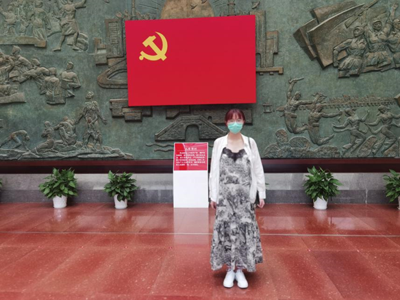 推开博物馆的大门,一面鲜艳的党旗赫然其中,浮雕上刻画着革命先烈浴血奋战的传奇。陈列柜前的注释文字为肖叶蓁展现了过去一百年间党践行初心和使命,领导人民共同开创建设伟大中国的壮丽画卷。