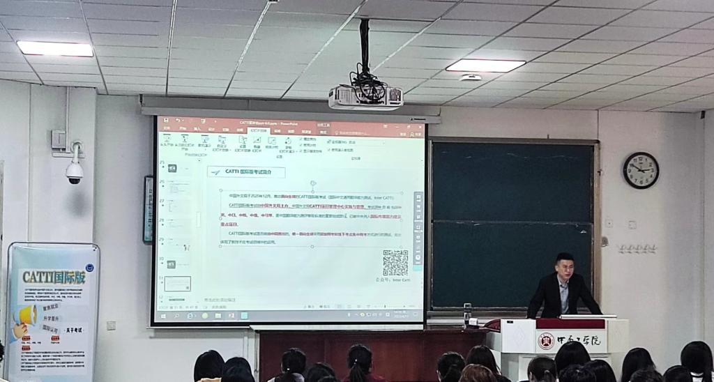 交流会上,郑州译线通翻译有限公司专业讲师刘延昊详细介绍了国际中文通用翻译能力测试(CATTI国际版)内容和基本要求,鼓励学生在校期间,有针对性开展外语综合能力及翻译实务训练,不断提升专业素养,为未来求职就业做好知识储备。河南汇品跨境电商发展有限公司崔权威结合公司业务开展情况,分享了跨境电商行业发展现状和人才需求形势;提醒同学们在学习专业课的同时,明确未来职业发展方向,并持续关注行业发展,开展有针对性地技能训练,不断提升自己的求职能力。
