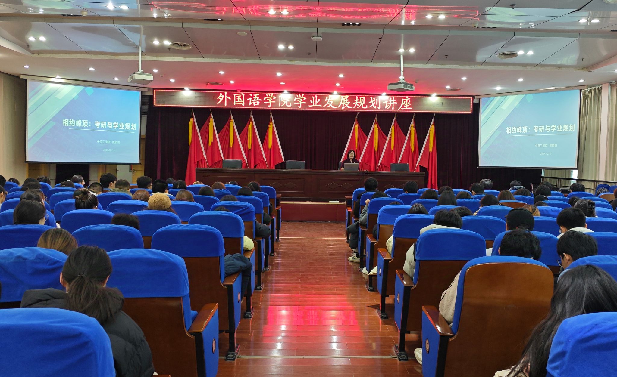 为引导大学生科学合理规划学业与职业发展,提升就业竞争力。12月10日下午,澳门十大电子正规游戏网站学生学业生涯规划专题讲座在图书馆北八楼学术报告厅成功举办。澳门十大电子正规游戏网站院长姚晓鸣教授以《相约峰顶:考研与学业规划》为题做辅导报告,澳门十大电子正规游戏网站党委副书记常潞炜、全体辅导员、2022、2023级全体学生参加讲座。