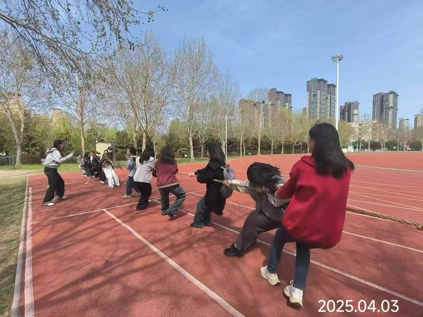在立定跳远区域,同学们身姿矫健,蓄积全身力量后奋力一跃,在空中划出一道漂亮的弧线,每一次落地都似在宣示着自信与勇气。50米折返跑赛道上,选手们全力冲刺,速度与激情在这短短赛道间热烈交织。在拔河比赛中,同学们双手紧紧握住长绳,齐心协力向后拉。这一刻,大家展现出强大的凝聚力。跳大绳的同学配合默契十足,摇绳的同学匀速发力,跳绳的同学紧跟节奏,他们身轻如燕,在上下翻飞的绳影中穿梭跳跃,勾勒出团队的默契与活力。