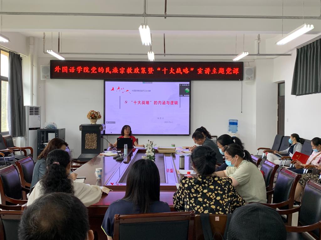 仲夏之月,万物方盛。6月21日下午,澳门十大电子正规游戏网站举办党的民族宗教政策宣讲会,并开展“十大战略”主题党课活动。会议邀请马克思主义学院民族宗教工作宣讲团成员陆俊杰博士作专题报告;澳门十大电子正规游戏网站党委书记柳素平以“’十大战略’的内涵与逻辑”为题,为全院党员讲专题党课,澳门十大电子正规游戏网站党委委员、领导班子成员和全体师生党员以线上线下相结合的方式参加,副院长柴高洁主持会议。
