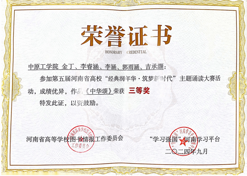近日,第五届河南省高校“经典润年华·筑梦新时代”主题诵读大赛结果出炉,十大电子官网汉语国际教育专业金丁、李睿涵、李涵、郭雨涵、吉承灏录制的朗诵作品《中华颂》荣获本科生组三等奖。