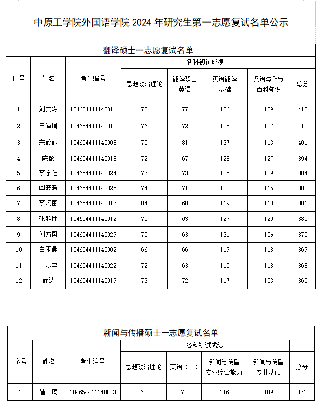 中原工学院澳门十大电子正规游戏网站2024年硕士研究生复试综合成绩公示(第一志愿 )