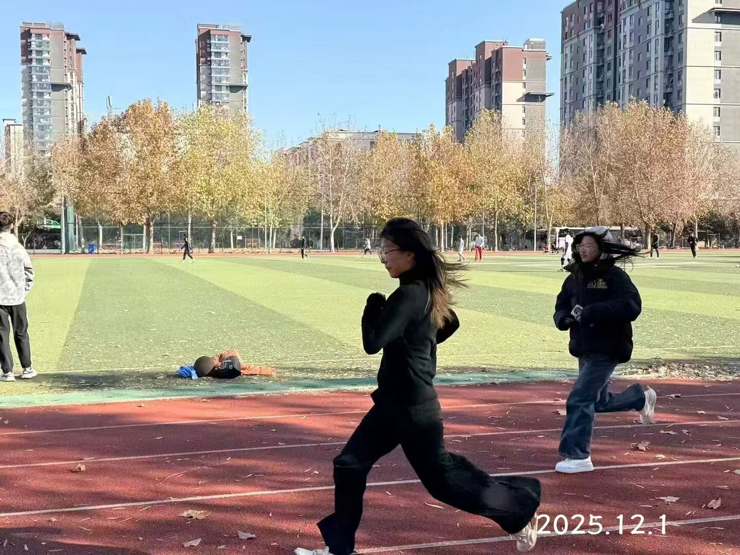 随着发令哨声响起,参赛选手们并肩冲出起点,脚步声整齐划一,奏响青春的节拍。赛道上,大家调整呼吸、稳步前行:有的保持匀速节奏,目光坚定地向着终点迈进;有的相互鼓劲,用呐喊驱散疲惫;即使体力渐耗、呼吸急促,也无人轻言放弃,汗水顺着脸颊滑落,浸湿衣衫,却浇不灭心中的斗志。
