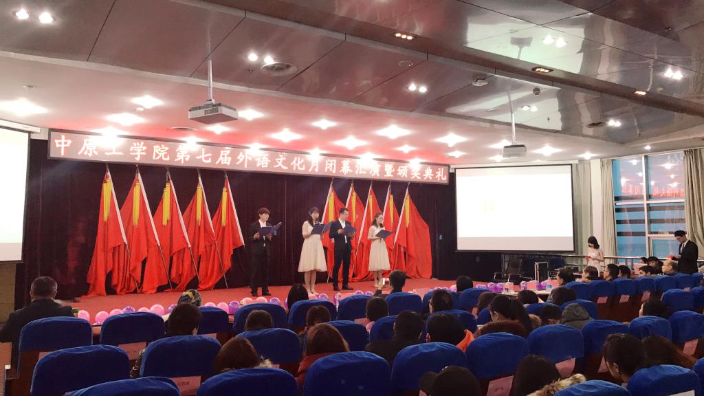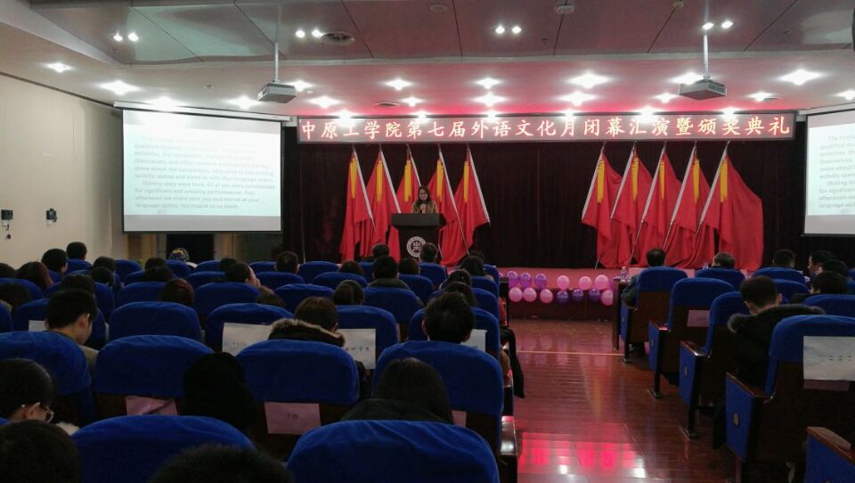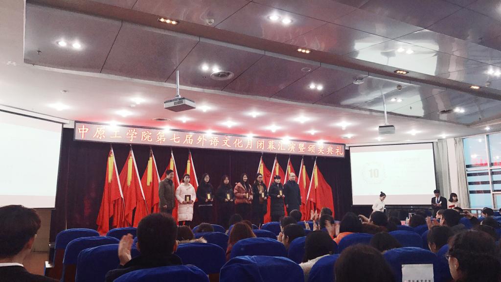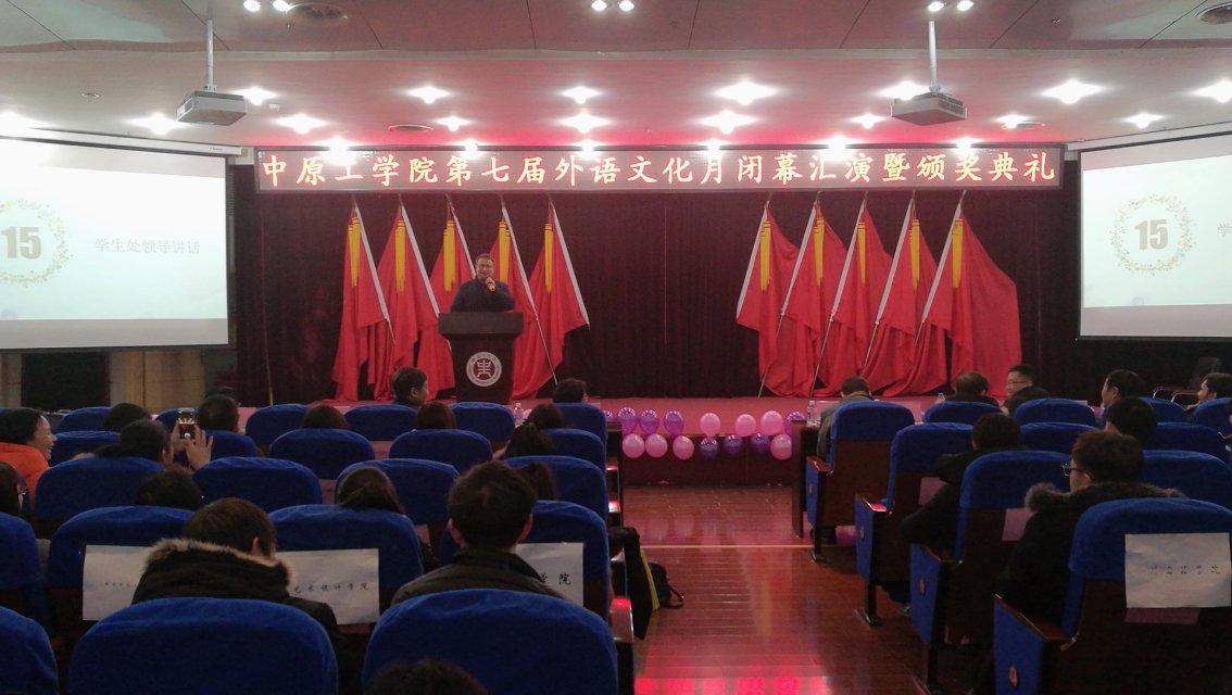 随着一系列比赛活动的结束,2017年12月15日下午四点,澳门十大电子正规游戏网站于图书馆北区八楼举办了“中原工学院第七届外语文化月闭幕汇演暨颁奖典礼”,总结外语文化月系列活动并进行成果展示。莅临本次活动的嘉宾有:中原工学院教务处处长刘洲峰,宣传部长张东伟,学生工作部部长、学生处处长田华泉,校团委书记张志增,经济管理学院总支书记张文勇,国际教育学院总支书记李廷利,对外合作与交流办公室主任谭恒,学生处副处长李士杰,澳门十大电子正规游戏网站院长郭万群,澳门十大电子正规游戏网站党总支书记姚晓鸣,各学校党支部副书记以及学生代表。
