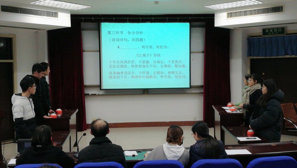 本次复赛为期三天,分为"对答如流","飞花令"以及"争分夺秒"三个环节,采取淘汰制,每个环节淘汰四人,每场比赛晋级四人。此次比赛可谓是异彩纷呈,经典的诗句,熟练的背默,激动人心的抢答,更有老师们一语中的的点评,现场气氛热烈,观众情绪高涨,掌声不断。最终,吴桐,牛新喜,刘通 ,水岳诚等十二名同学杀出重围,晋级决赛,三场复赛圆满结束。