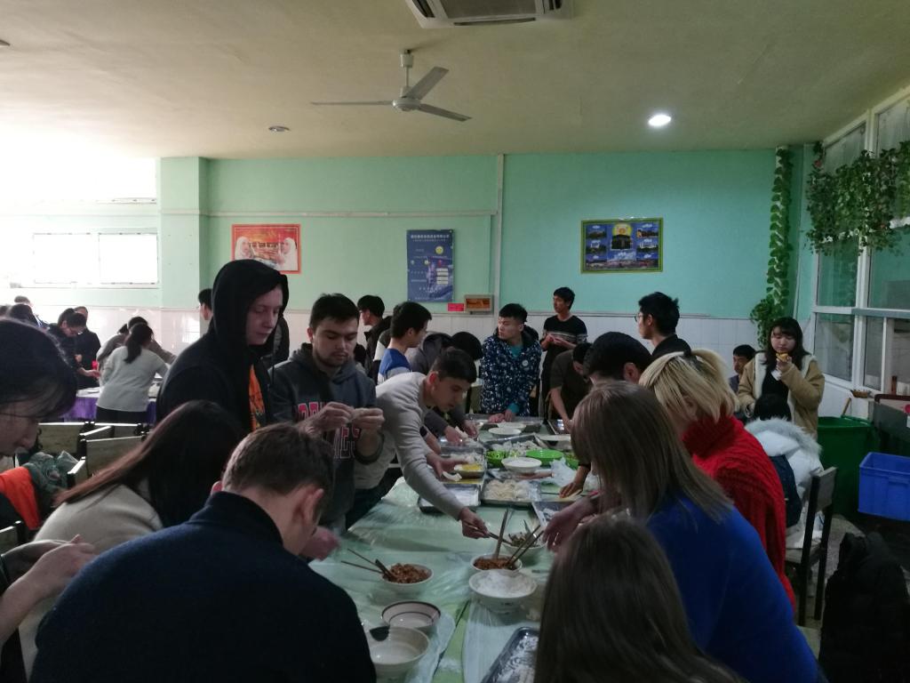 中午11:30,师生们齐聚南苑餐厅。老师学生们积极性都很高,留学生们更是对饺子这种传统美食表现出浓厚兴趣。老师们不仅贴心地为大家准备好丰富的食材,还亲自上手示范,耐心地指导学生们包饺子。留学生虽然是第一次包饺子,却十分认真地在一旁观察学习,跃跃欲试。席间,气氛温馨融洽,老师学生有说有笑,其乐融融。