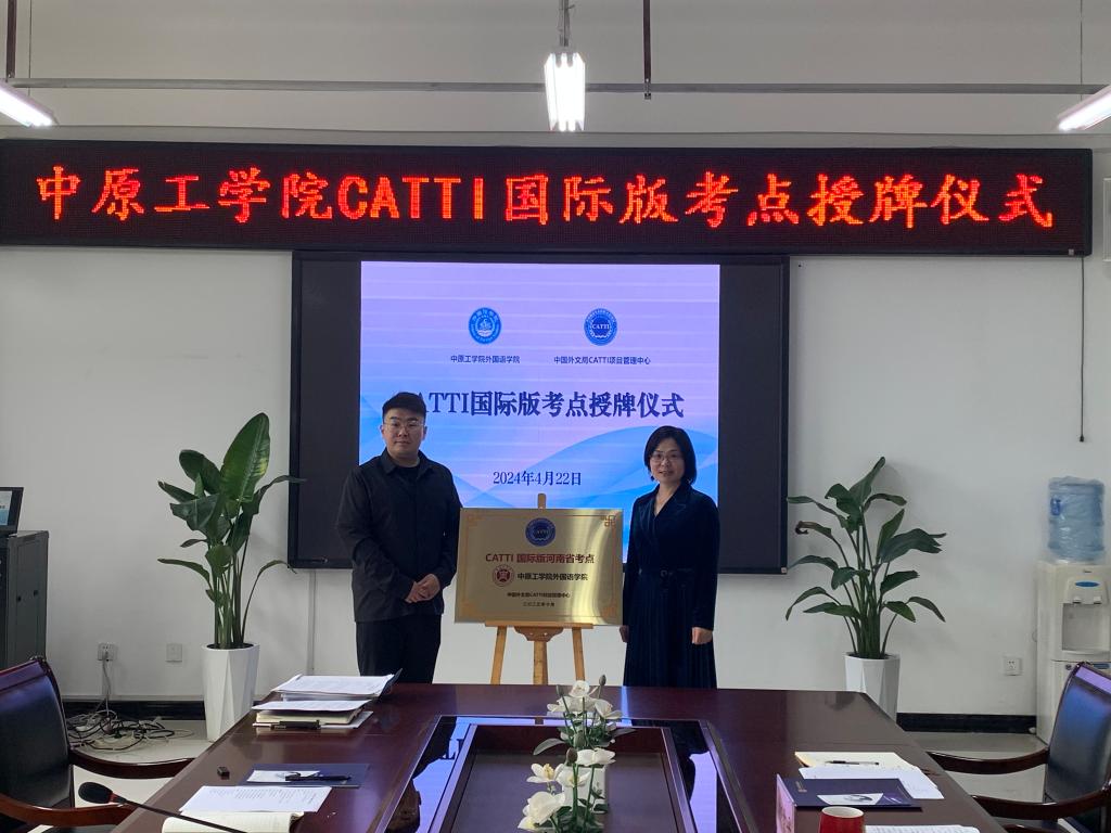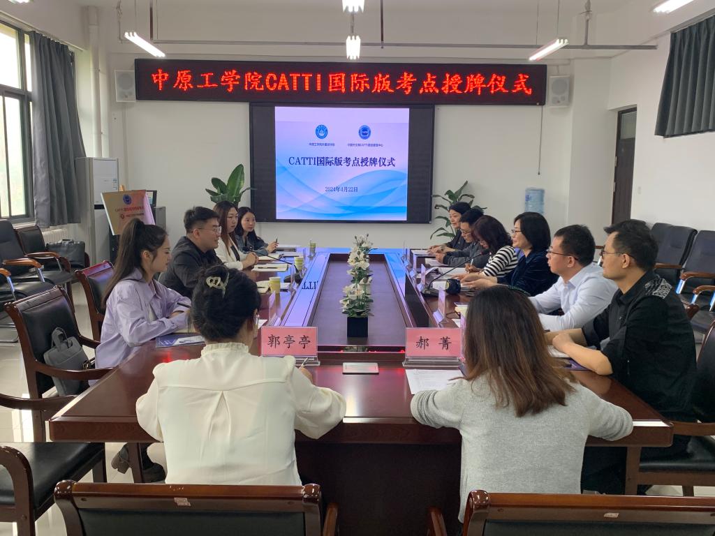 2024年4月22日上午,中原工学院CATTI(全国翻译专业资格(水平)考试)国际版考点授牌仪式在十大电子官网龙湖校区澳门十大电子正规游戏网站会议室举行。中国外文局全国翻译专业资格(水平)考试项目中心主任赵怡隆、专项负责人刘攀,译线通翻译公司校企合作事业部经理鲍俐俐、专员邢亚娟参加考点授牌仪式。澳门十大电子正规游戏网站全体领导班子成员,办公室和英语系主任出席会议,学院院长姚晓鸣主持会议。